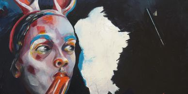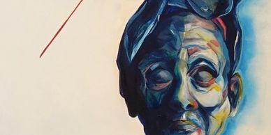 Here I paint in bold contrasting colours, unlike the Masters (they used to use black and white mainly) and play with light, dark and dramatic tones. I try and capture the false faces we all present to the world